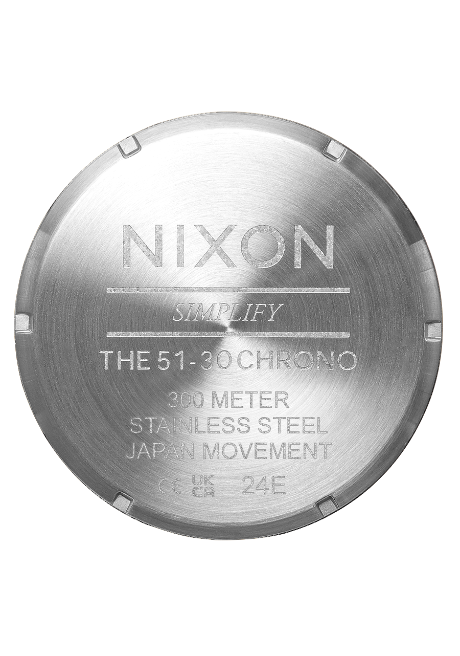 Caja personalizada de acero inoxidable macizo de 51 mm con resistencia al agua de 300 metros / 30 ATM. Incluye bisel giratorio unidireccional con temporizador de cuenta regresiva, cristal mineral endurecido, corona y pulsadores atornillados, fondo de caja atornillado de acero inoxidable y asas con pasadores atornillados.