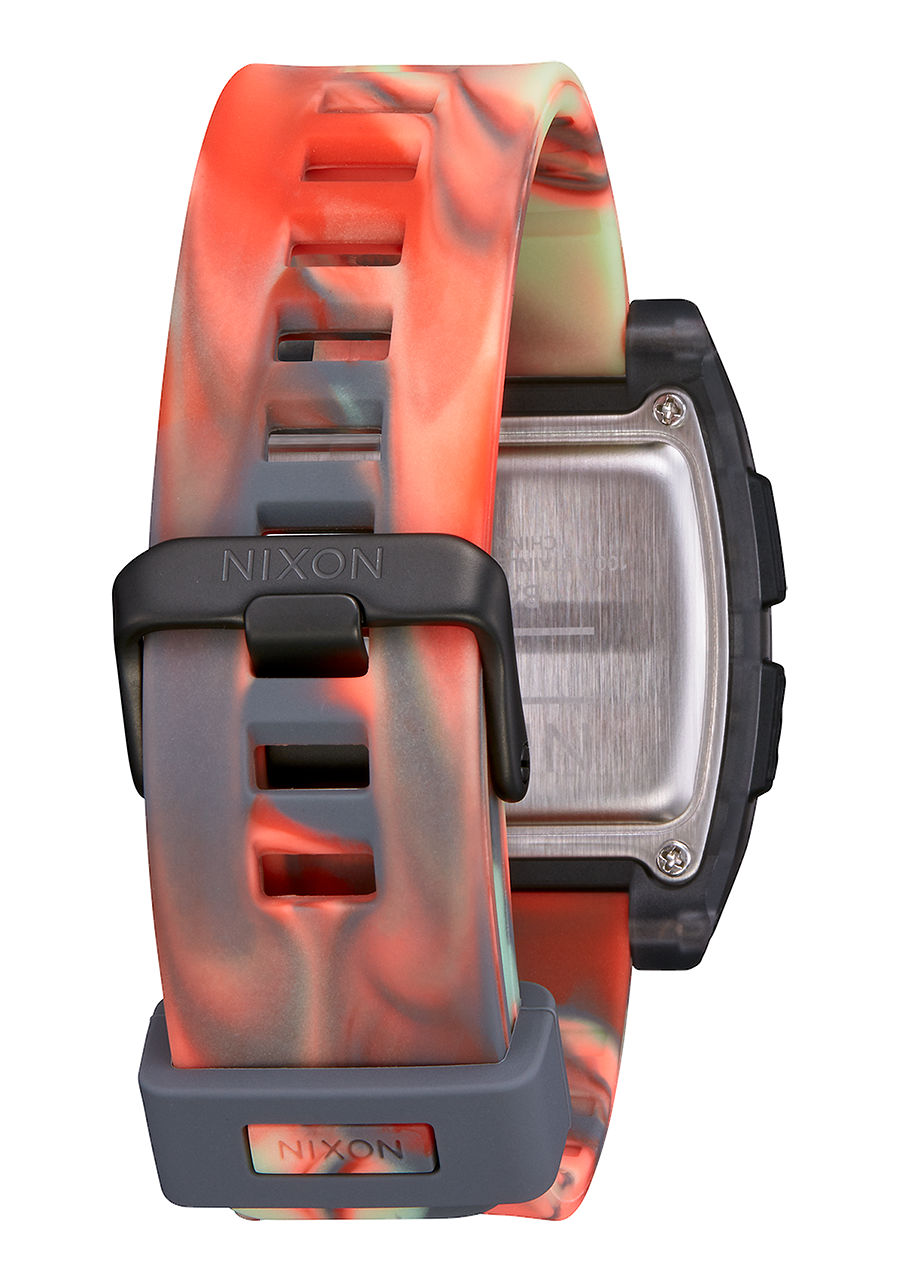 38 mm, 100 metros/10 ATM, TR90 moldeado por inyección personalizado. Pulsadores moldeados a medida de policarbonato con junta, fondo de caja atornillado de acero inoxidable y asas de barra atornillada de acero inoxidable.