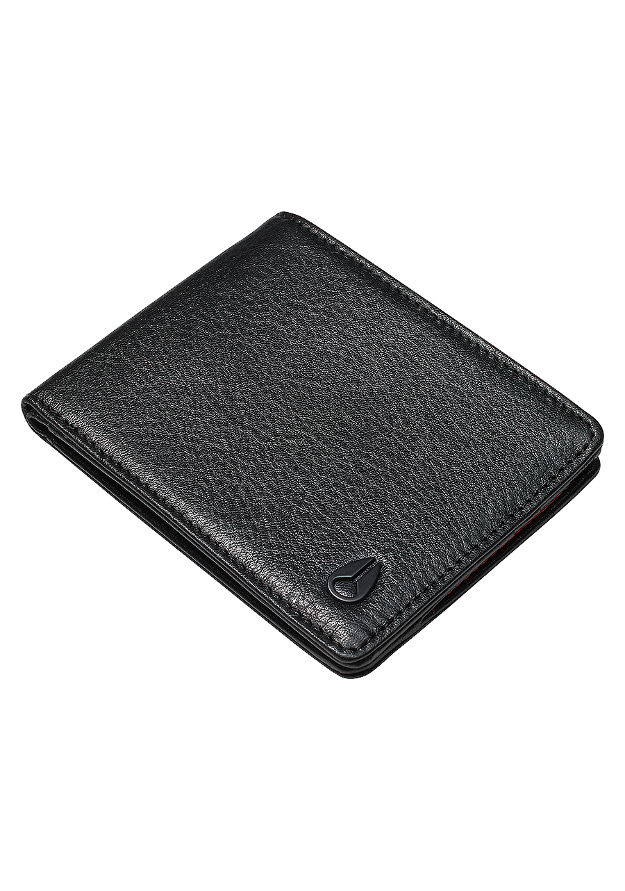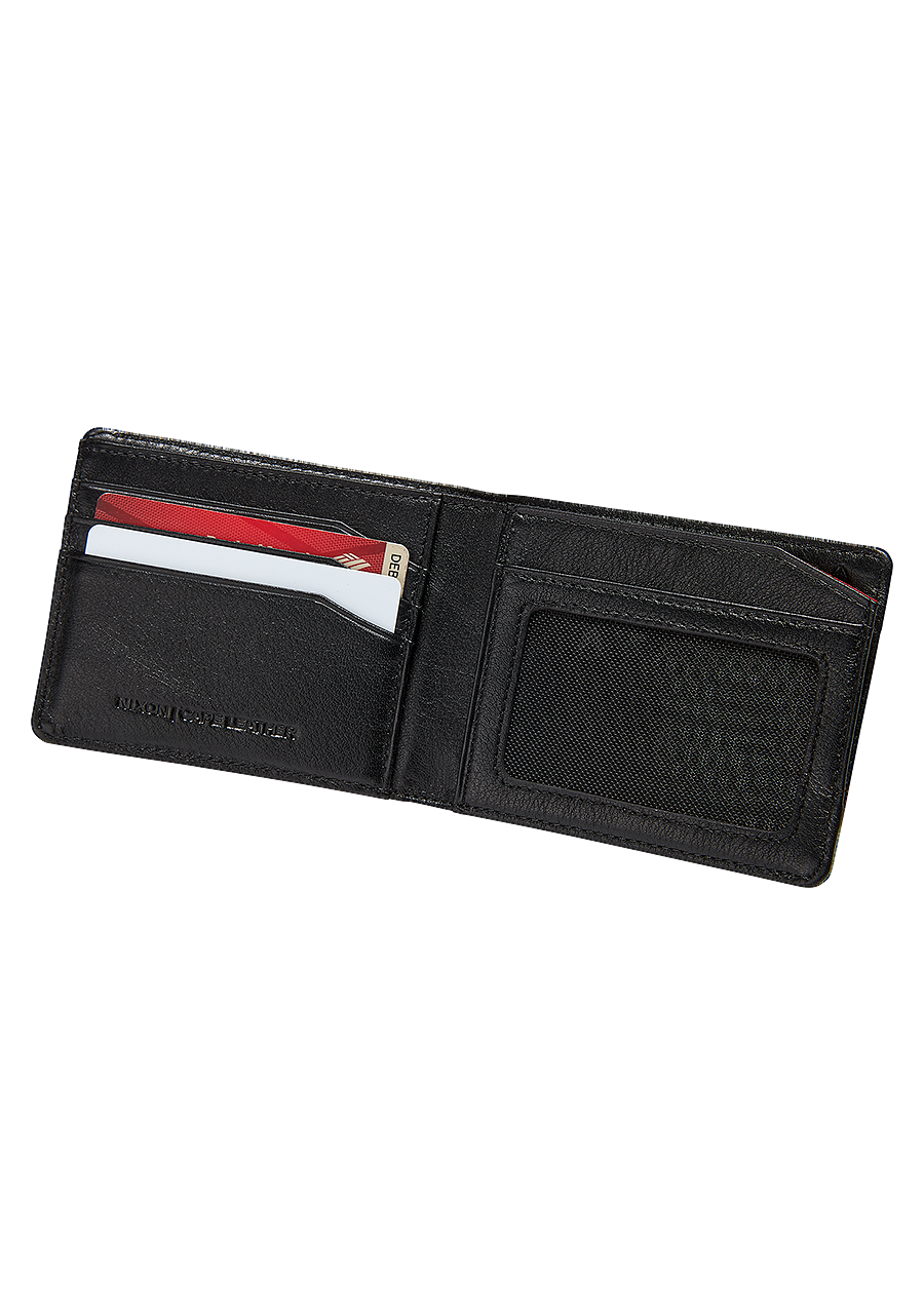Cartera de piel auténtica 100 % con interior estampado. Incluye compartimento para billetes de fácil acceso, funda de malla para DNI y remache metálico con el logotipo en la parte delantera.