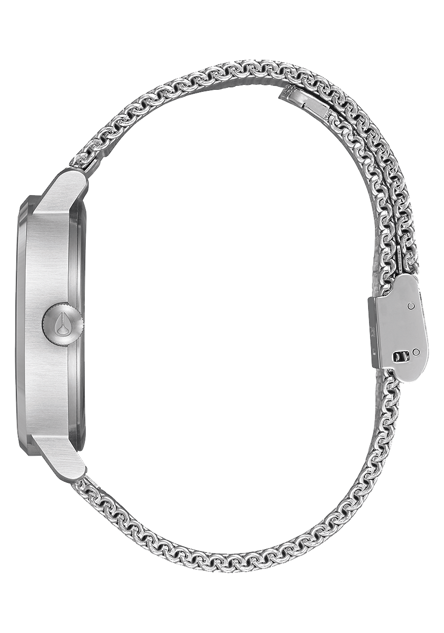 Caja sólida de acero inoxidable de 38 mm, 50 metros/5 ATM con cristal mineral endurecido y fondo de caja atornillado.
