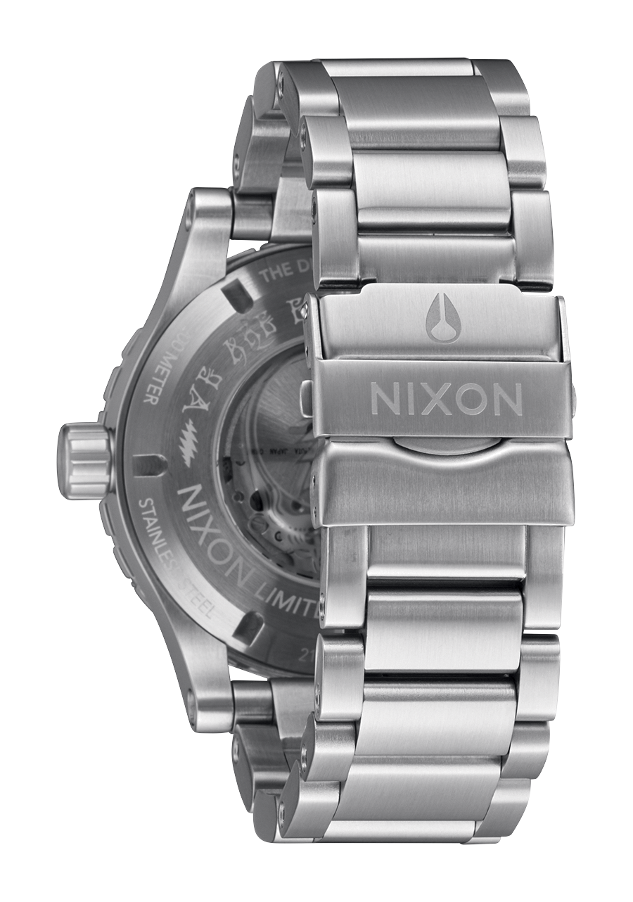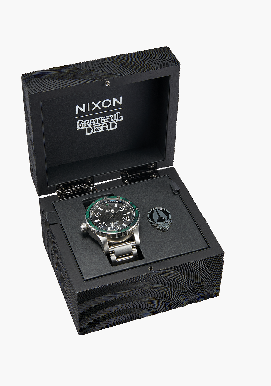 Detalles de Grateful Dead desde la incrustación de acetato alrededor del bisel que coincide con el marcador de piedra de malaquita a las 12 en punto, hasta el rayo de 13 puntas moldeado a medida en la aguja de los segundos y grabado en la corona. El movimiento automático se revela a través del cristal trasero que presenta la calavera Steal Your Face y un mensaje especial de Dead Head alrededor del borde. Para completar, este paquete premium incluye un pin esmaltado de recuerdo.