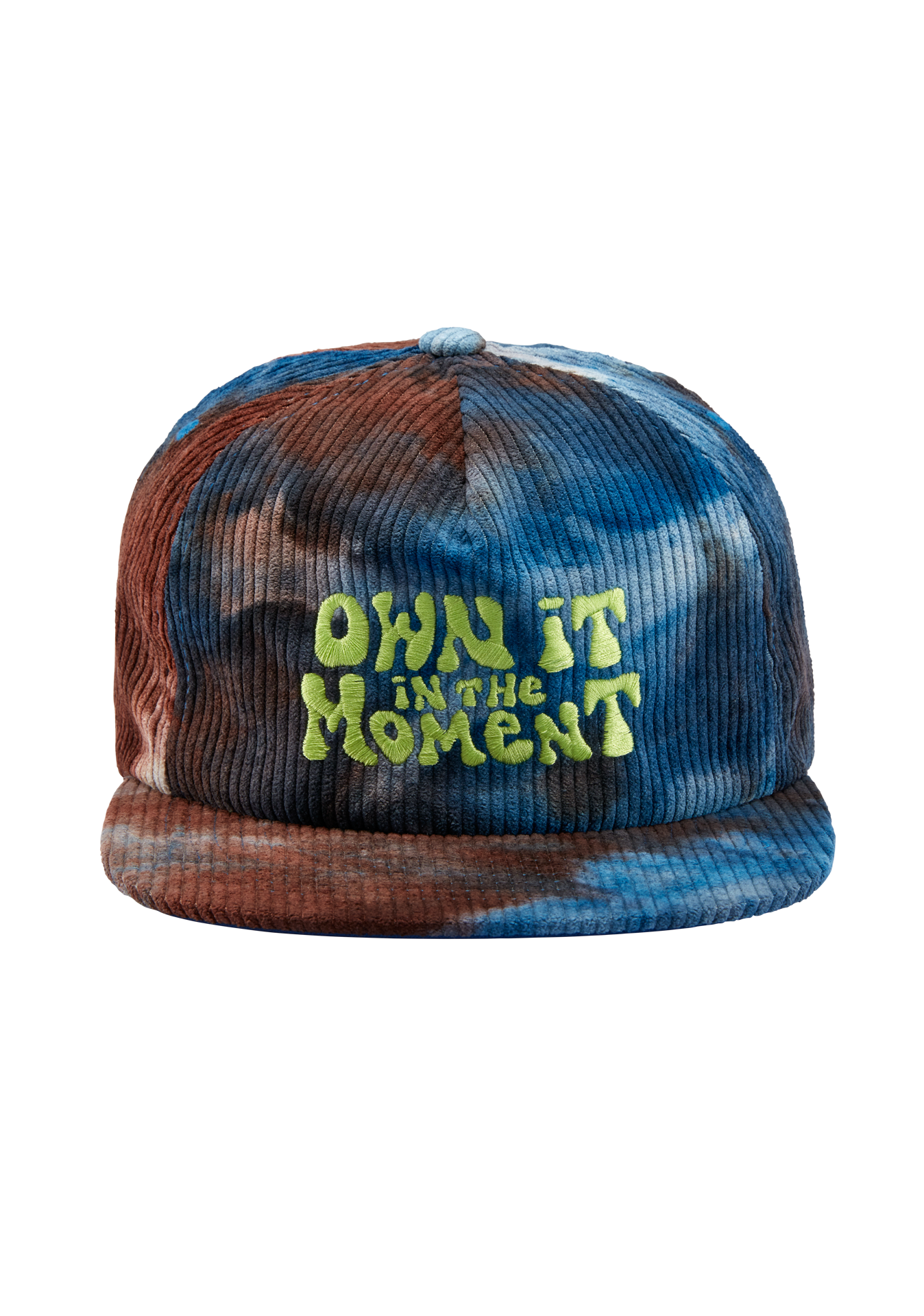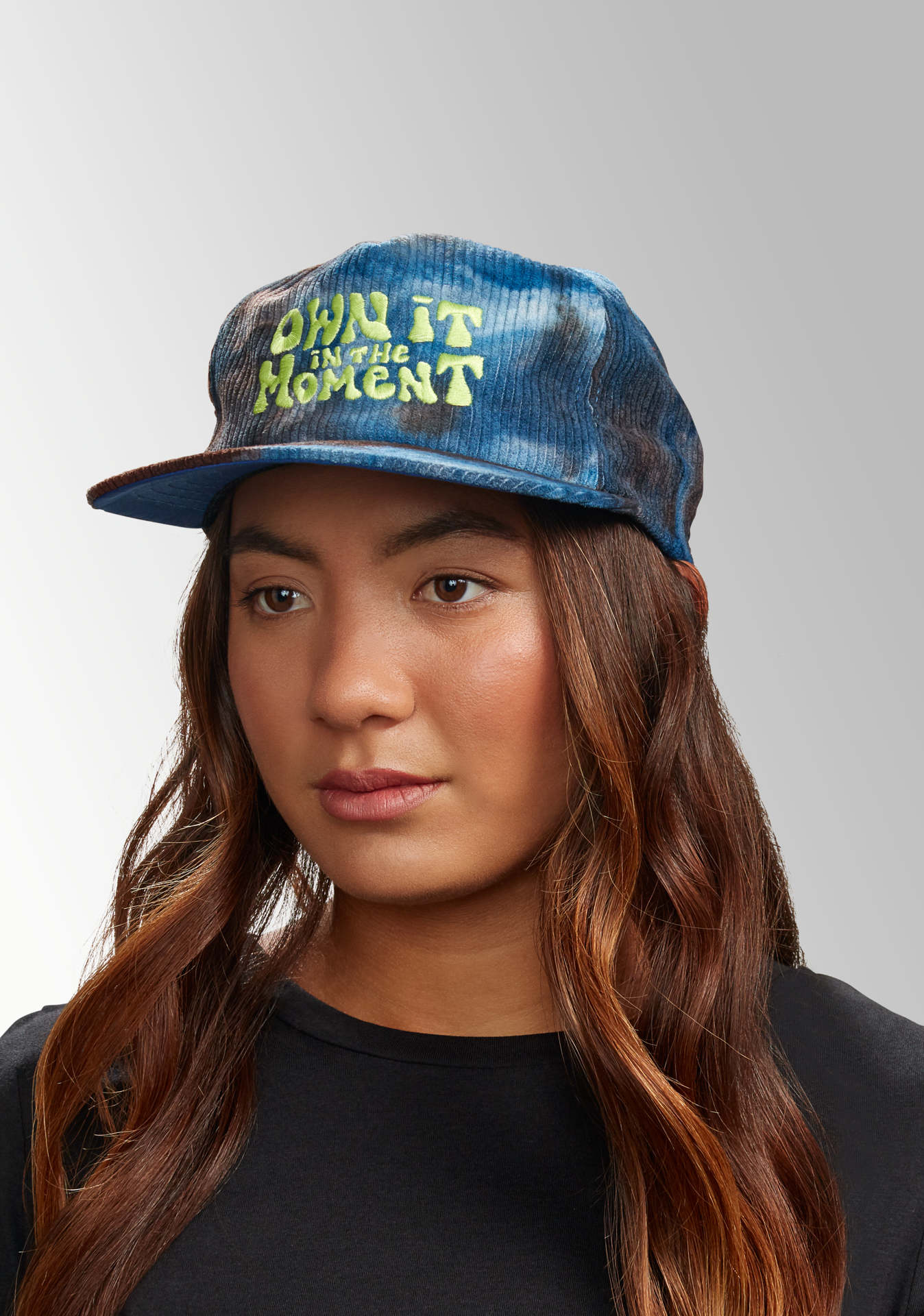 Own It in the Moment con elementos visuales tie-die y poliéster 100 % reciclado. Diseñado en colaboración con la artista Hannah Eddy, este sombrero presenta su mantra para darte un toque de estilo adicional.