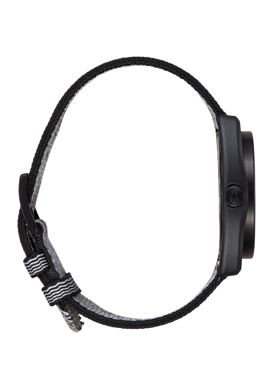 La esfera incluye índices aplicados en forma de barra y el logotipo de la marca Nixon. Viene con manecillas de hora y minuto en forma de alambre. La manecilla de segundos se extiende a lo largo de la esfera del reloj.
