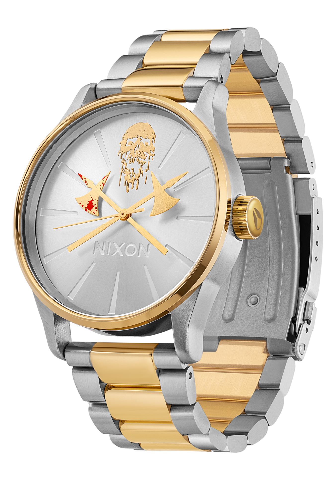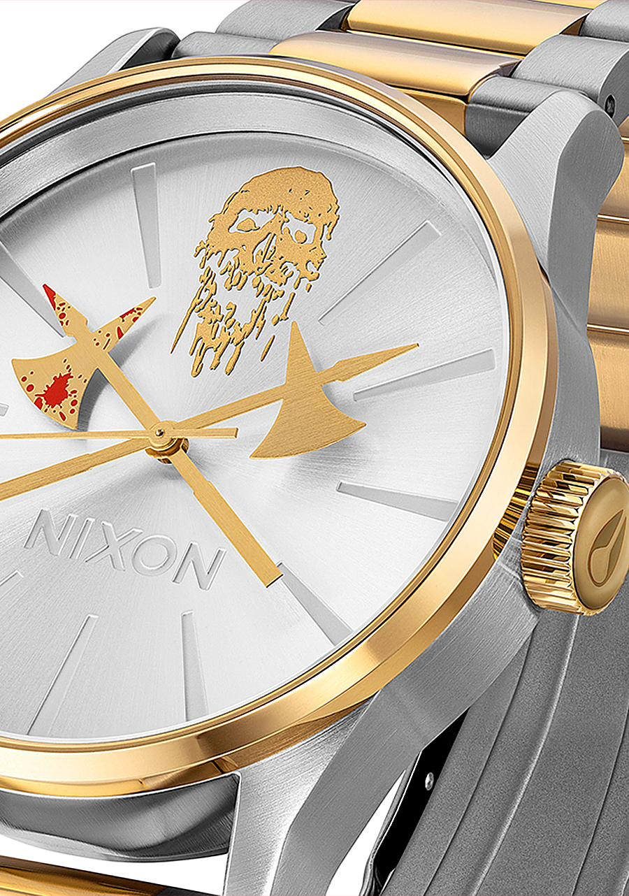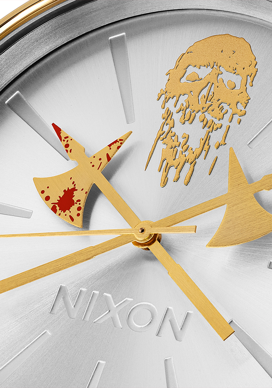 La esfera presenta índices grabados, una calavera dorada impresa y pulida, y manecillas moldeadas a medida con detalles de sangre goteante.