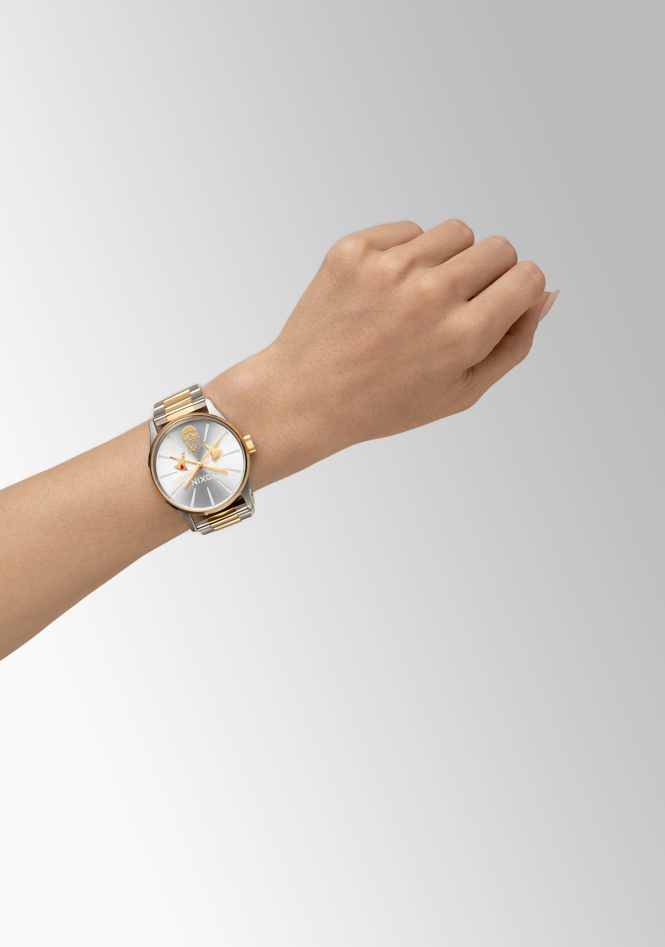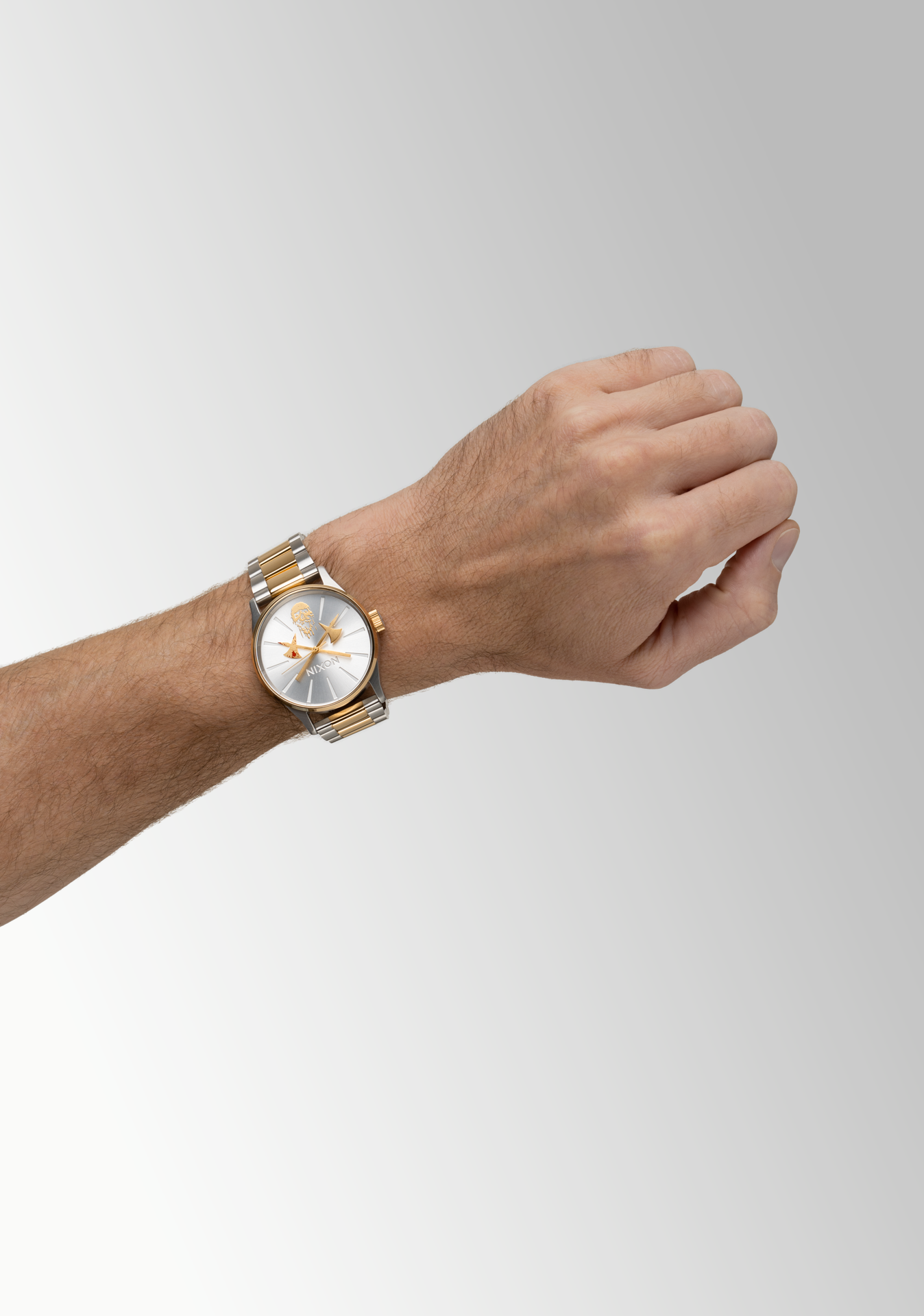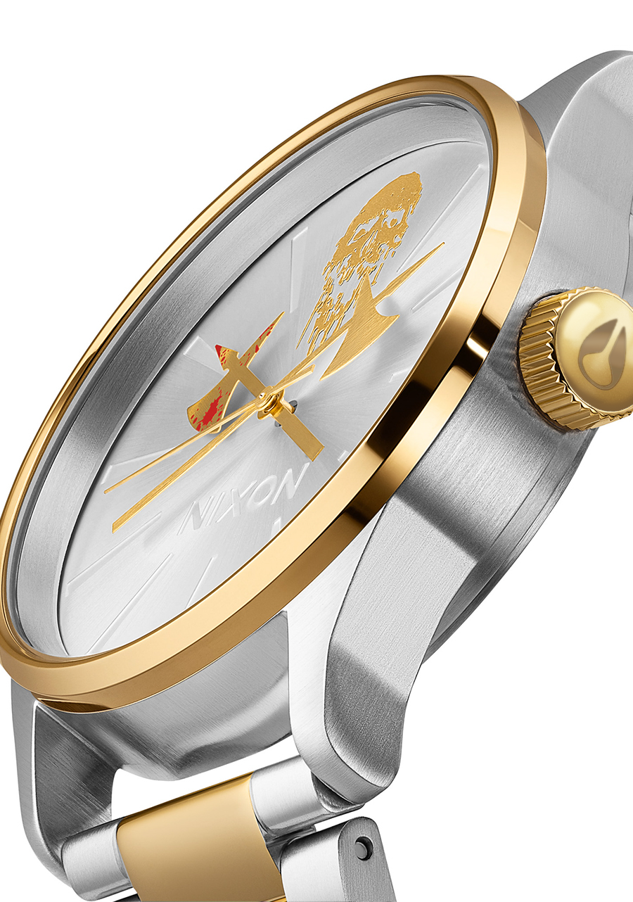 La esfera presenta índices grabados, una calavera dorada impresa y pulida, y manecillas moldeadas a medida con detalles de sangre goteante.