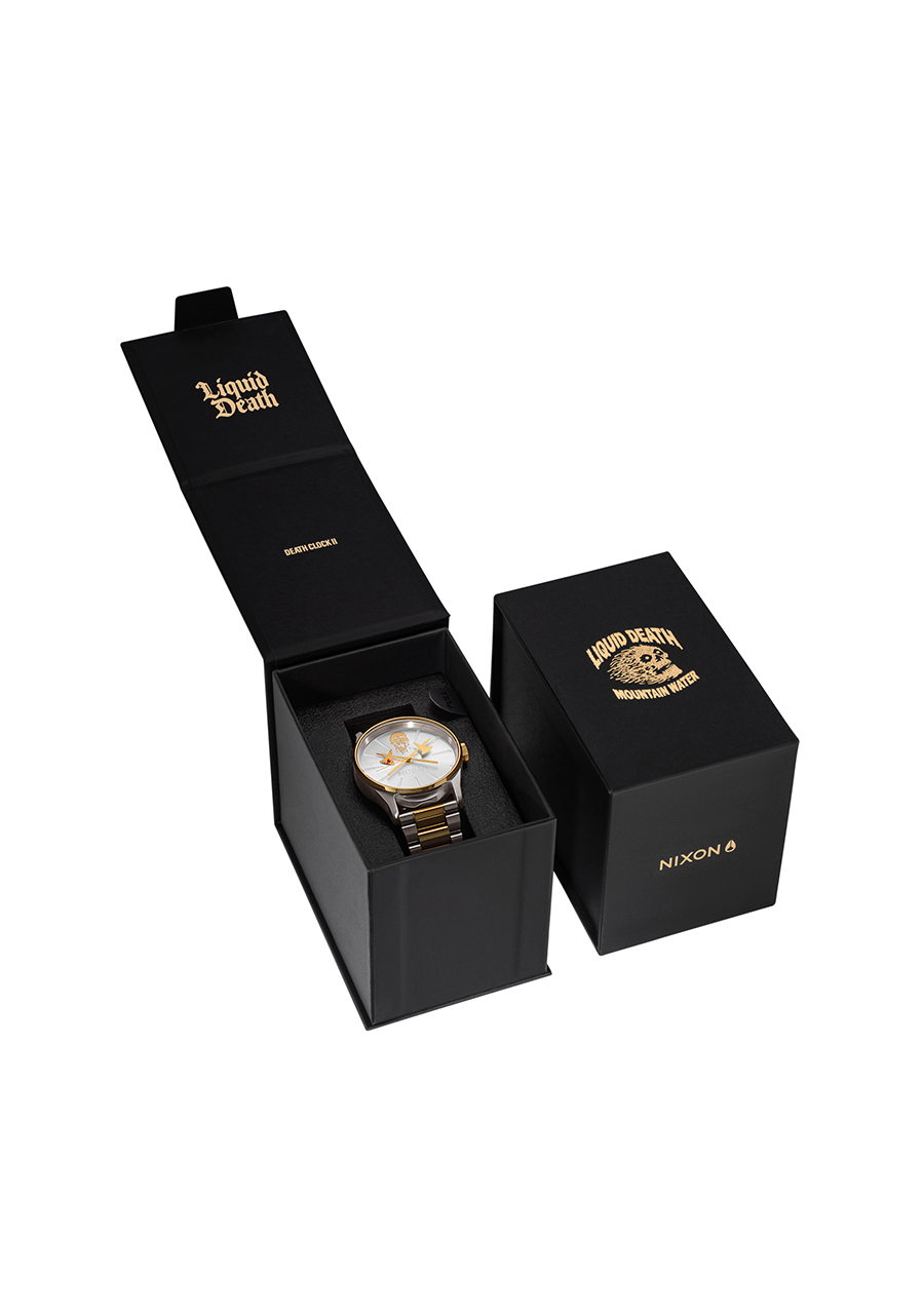 Esfera personalizada Liquid Death, manecillas en forma de hacha y fondo de caja. Además, el brazalete de acero inoxidable de 3 eslabones con cierre doble de seguridad y microajuste te ofrece un ajuste preciso para ocasiones cruciales.