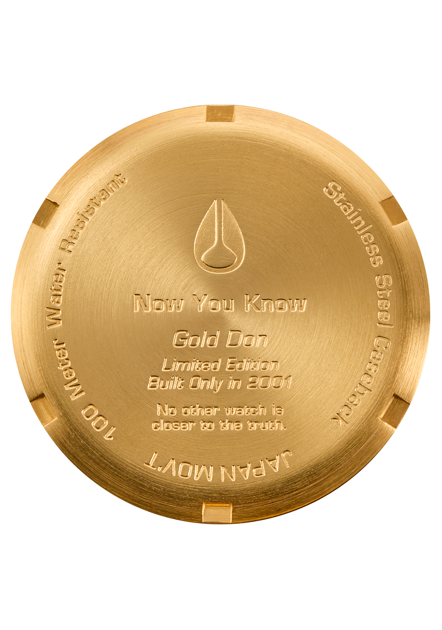 Esta versión del Nixon Don está chapada con oro de 23 quilates real. Un número muy limitado de estos relojes clásicos Nixon están disponibles para su compra.