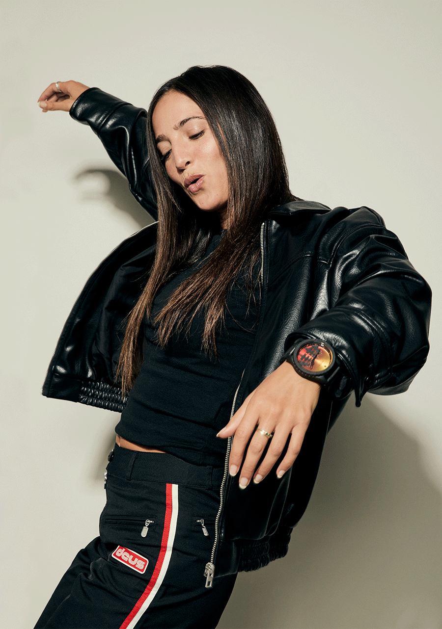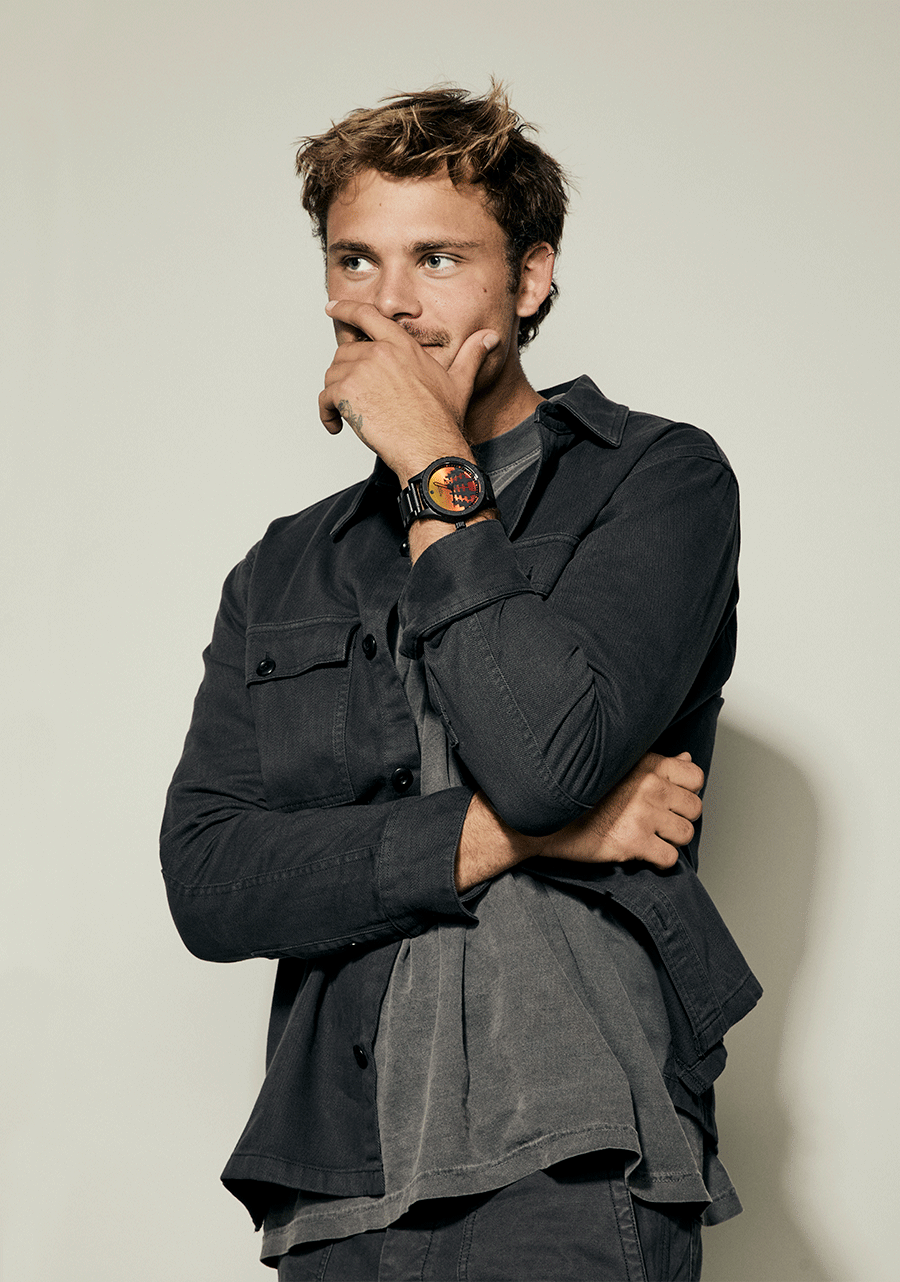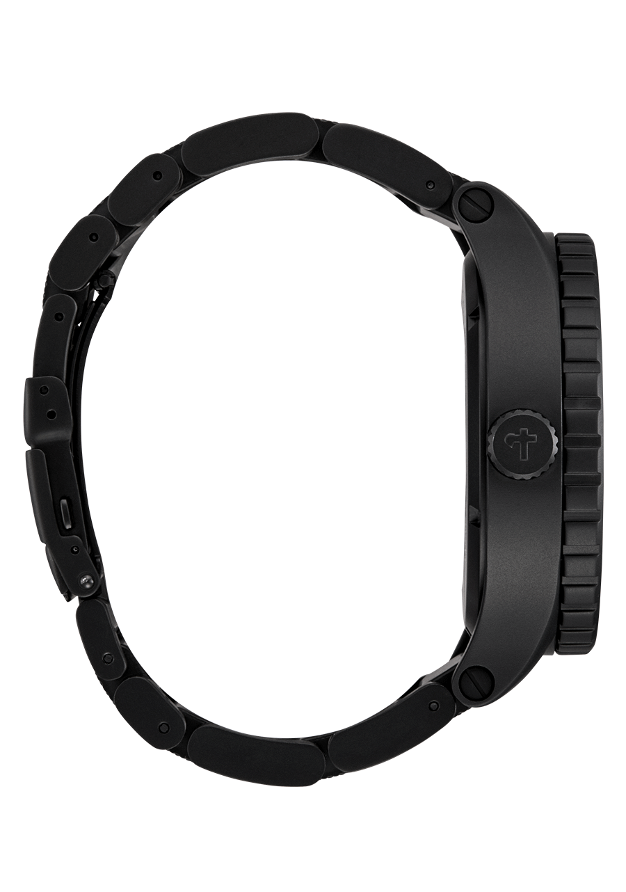 La corona está ubicada en el lado de las 9 en punto de la caja en lugar de las 3 para evitar el "mordisco de muñeca" durante el uso activo. Bisel giratorio unidireccional para un temporizador de cuenta regresiva analógico.
