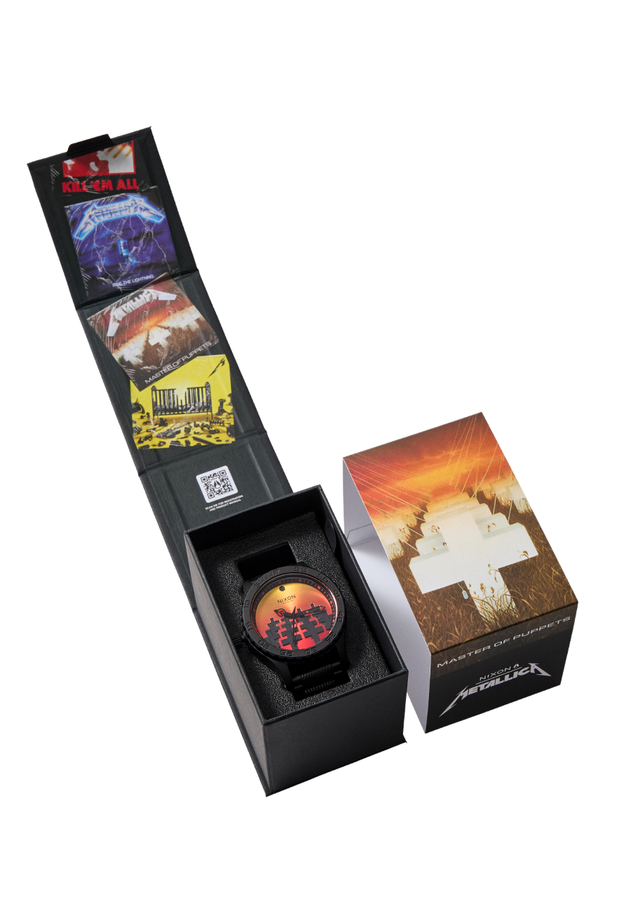 Three of Metallica's legendary albums get the full Nixon treatment with the artwork for Master of the Puppets, Ride the Lightning, and Kill 'Em All front and center display on the dial. But we didn't stop there. Custom-built hour and minute hands prove that the little details make a huge difference, while the matching collectible packaging takes these watches straight into the VIP section.