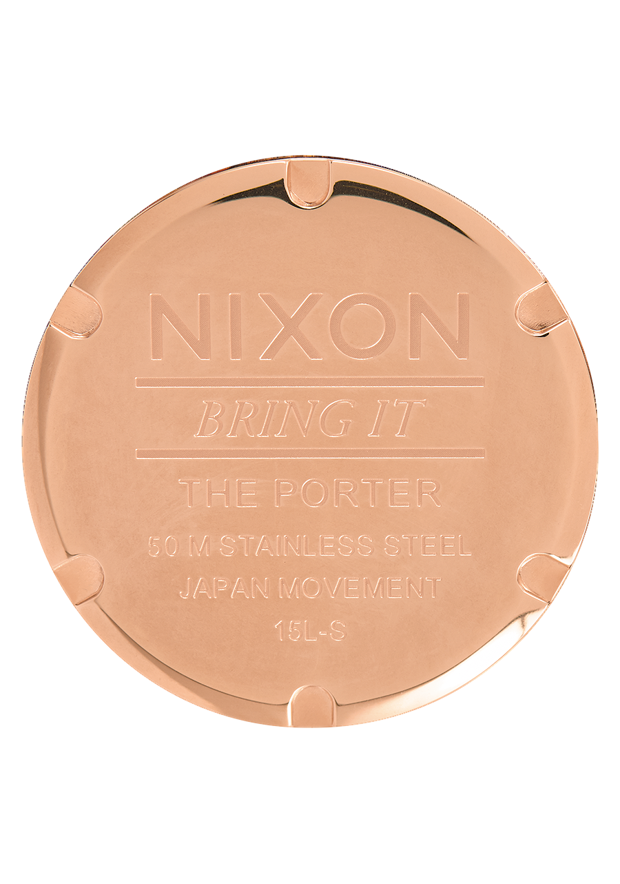 La caja del Nixon Porter Leather está hecha de acero inoxidable personalizado, mientras que la correa está hecha de cuero. Para cuidar la correa de cuero, primero limpia cualquier polvo con un paño de microfibra seco. Luego, humedece ligeramente el paño y limpia suavemente cualquier suciedad de la correa. Finalmente, deja que la correa se seque al aire. Para obtener más información sobre cómo limpiar correas de reloj de cuero, visita nuestro blog.
