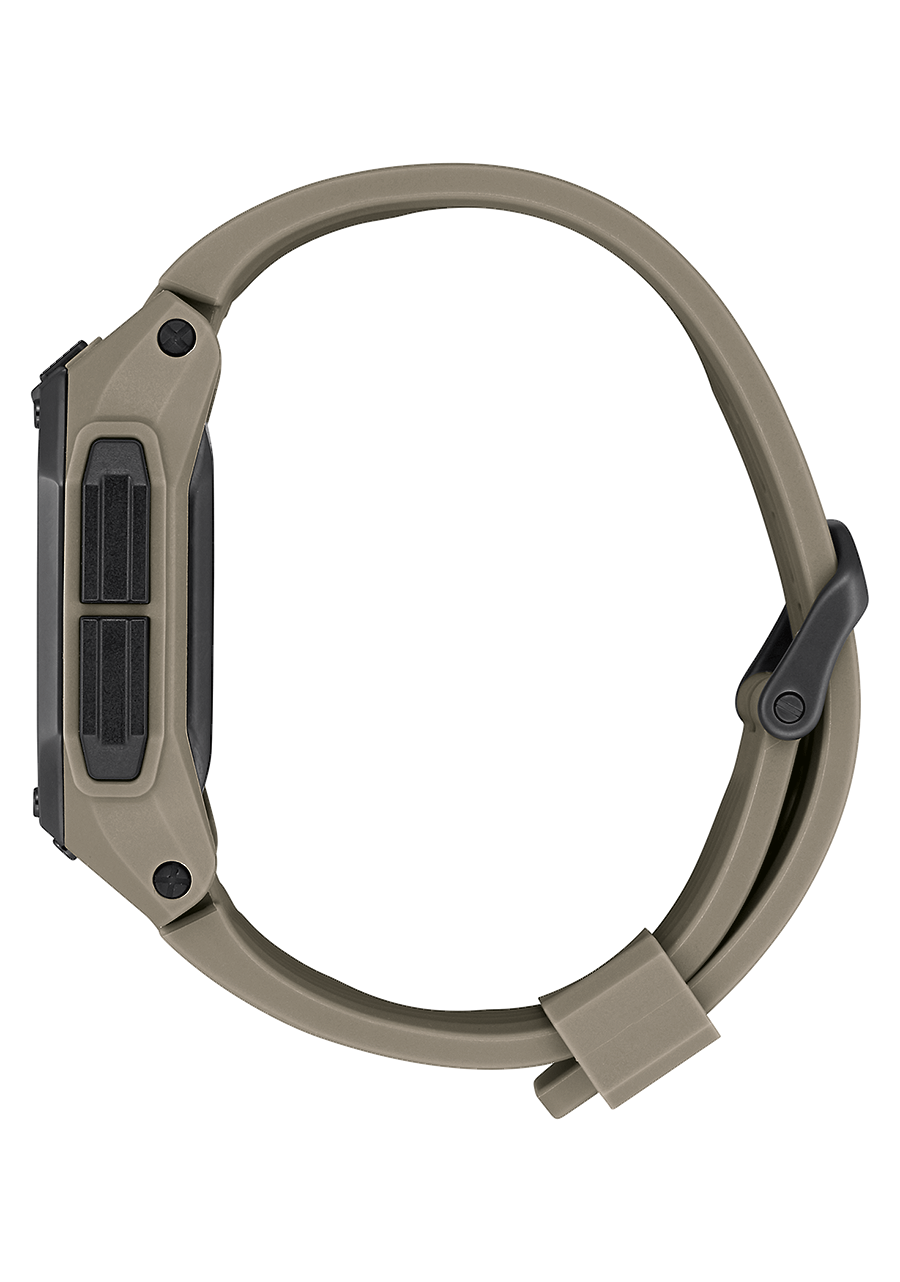 Módulo digital LCD personalizado encerrado en una carcasa protectora de PU y acolchado de espuma Poron para una absorción de impactos y durabilidad súper resistentes. Las funciones incluyen hora dual, hora del día (12 o 24 horas), día/fecha, calendario automático hasta 2099, doble cronógrafo con resolución de 1/100 de segundo visible en todas las pantallas de modo, temporizador regresivo, 3 alarmas independientes, luz LED ajustable y modo silencioso.