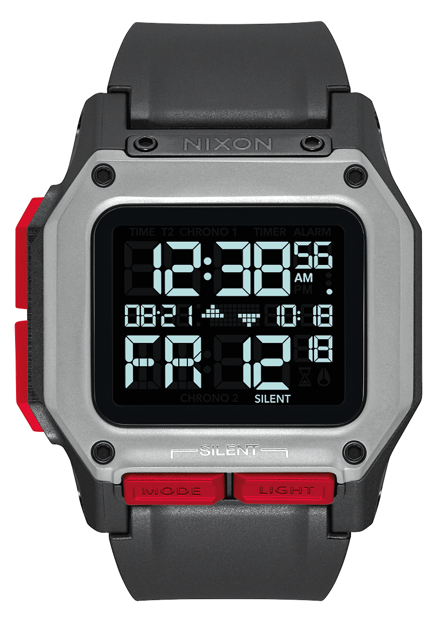 Módulo digital LCD personalizado encerrado en una carcasa protectora de PU y acolchado de espuma Poron para una absorción de impactos y durabilidad súper resistentes. Las funciones incluyen hora dual, hora del día (12 o 24 horas), día/fecha, calendario automático hasta 2099, doble cronógrafo con resolución de 1/100 de segundo visible en todas las pantallas de modo, temporizador regresivo, 3 alarmas independientes, luz LED ajustable y modo silencioso.