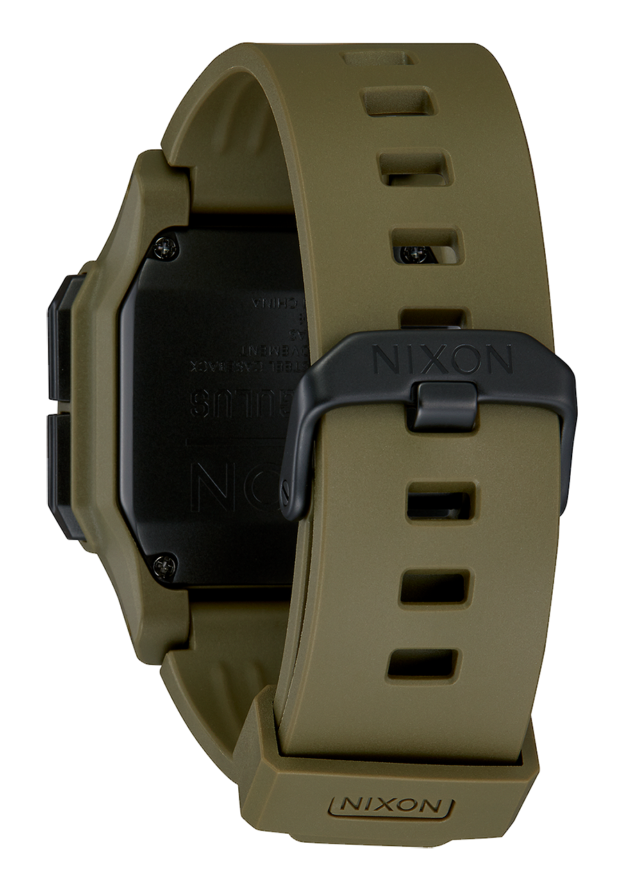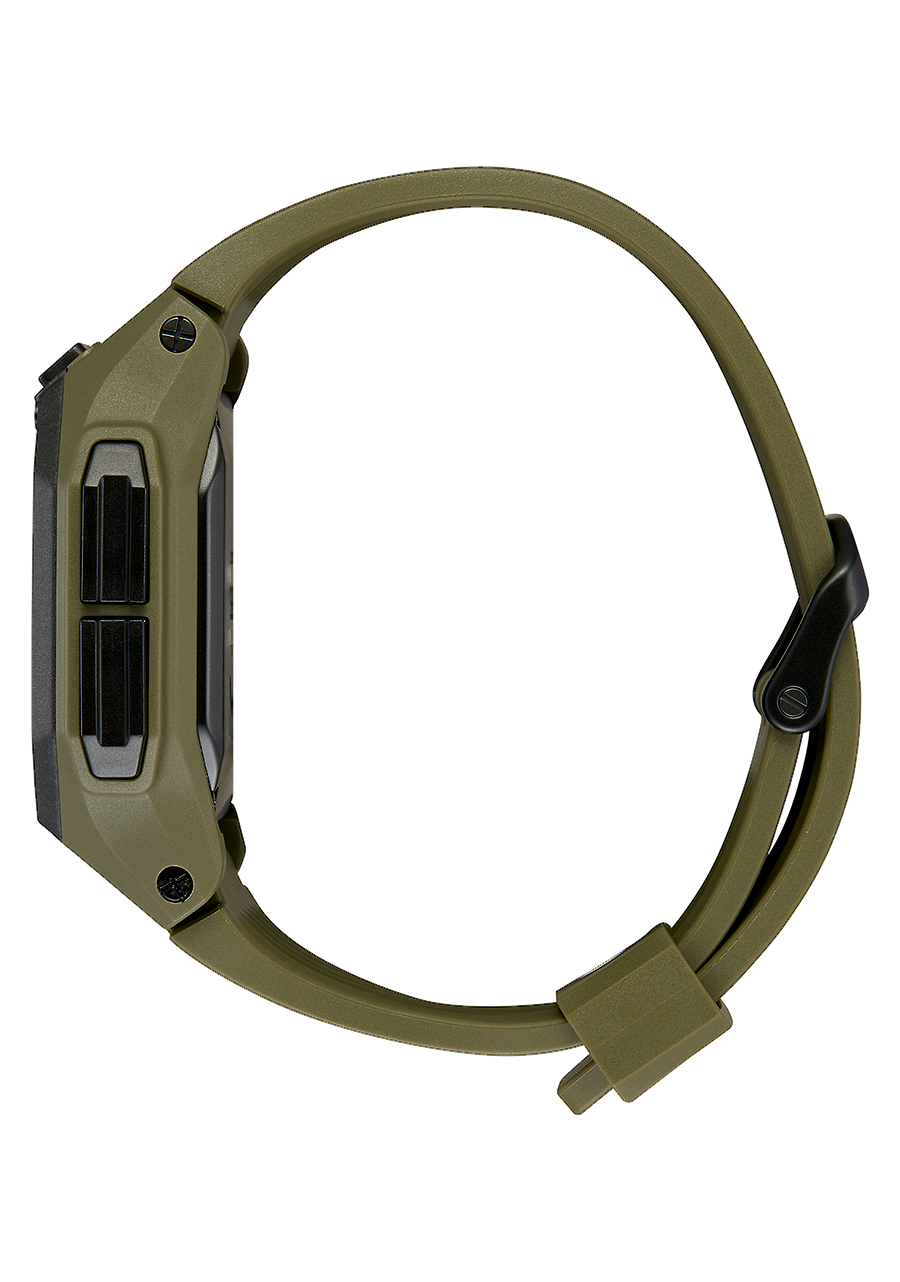 Módulo digital LCD personalizado encerrado en una carcasa protectora de PU y acolchado de espuma Poron para una absorción de impactos y durabilidad súper resistentes. Las funciones incluyen hora dual, hora del día (12 o 24 horas), día/fecha, calendario automático hasta 2099, doble cronógrafo con resolución de 1/100 de segundo visible en todas las pantallas de modo, temporizador regresivo, 3 alarmas independientes, luz LED ajustable y modo silencioso.