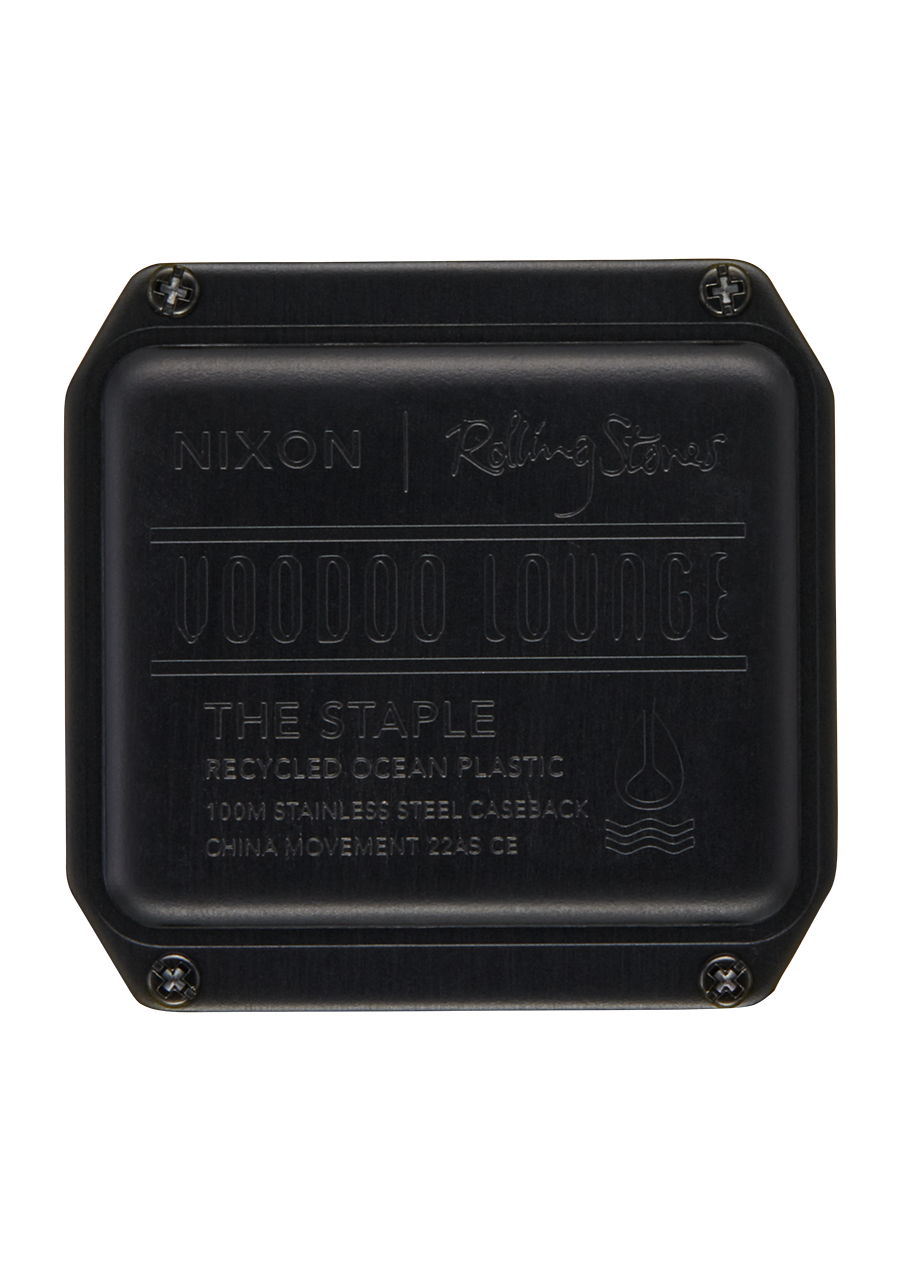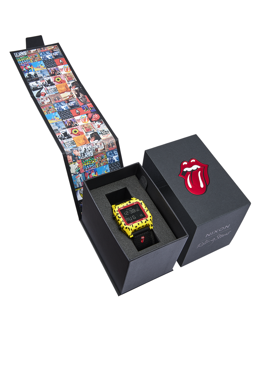 Una caja voodoo amarilla inspirada en el arte del álbum de los Stones, mientras que los logotipos duales de Nixon y Stones adornan la correa orientada al rendimiento. Las funciones incluyen hora del día, día/fecha con calendario automático hasta 2099, cronógrafo con resolución de 1/100 de segundo, temporizador, alarma y luz de fondo EL. El diseño de la pantalla permite mostrar simultáneamente dos funciones.