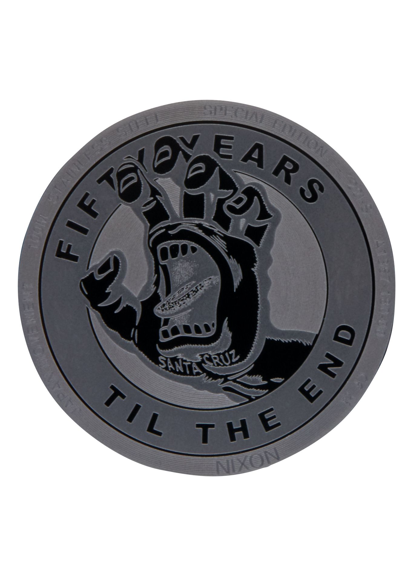 La esfera presenta manecillas moldeadas a medida con una manecilla de segundos Screaming Hand, índices de barra y el logo Santa Cruz en relieve 3D aplicado.