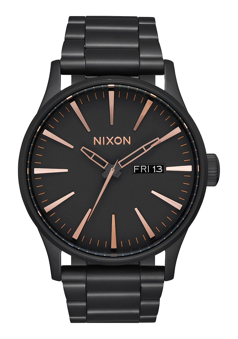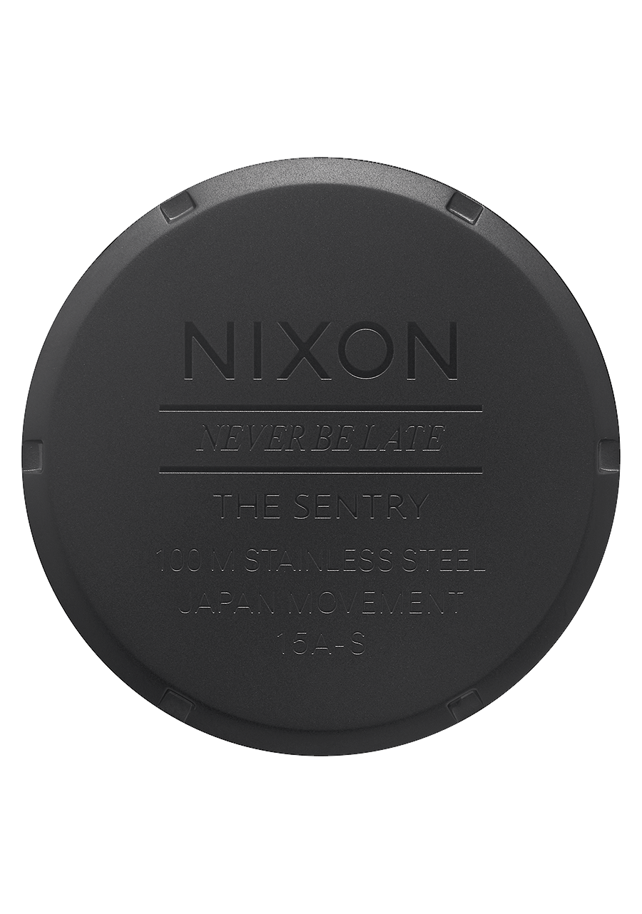 El reloj Nixon Sentry de acero inoxidable utiliza un movimiento de cuarzo Miyota 2305 japonés de 3 agujas y cuenta con una función bilingüe de día y fecha en inglés y español.