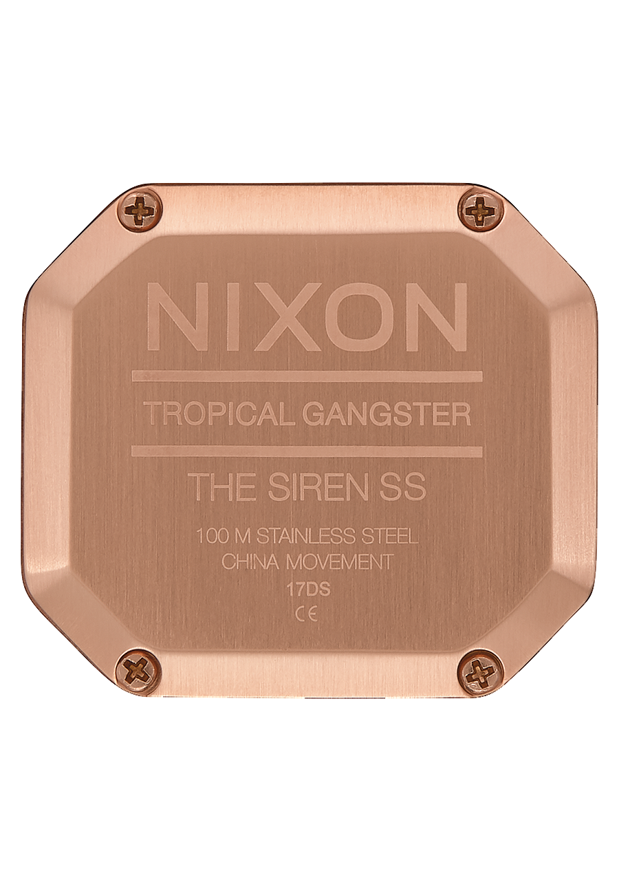 El Nixon Siren Stainless Steel utiliza una caja de acero inoxidable personalizada con barras y pulsadores de acero inoxidable, y una correa de silicona ultra suave moldeada por inyección con una hebilla de acero inoxidable sólido y barras de tornillo. El reloj es resistente al agua hasta 100 metros / 10 ATM, lo que lo hace altamente duradero para uso en agua y deportes.