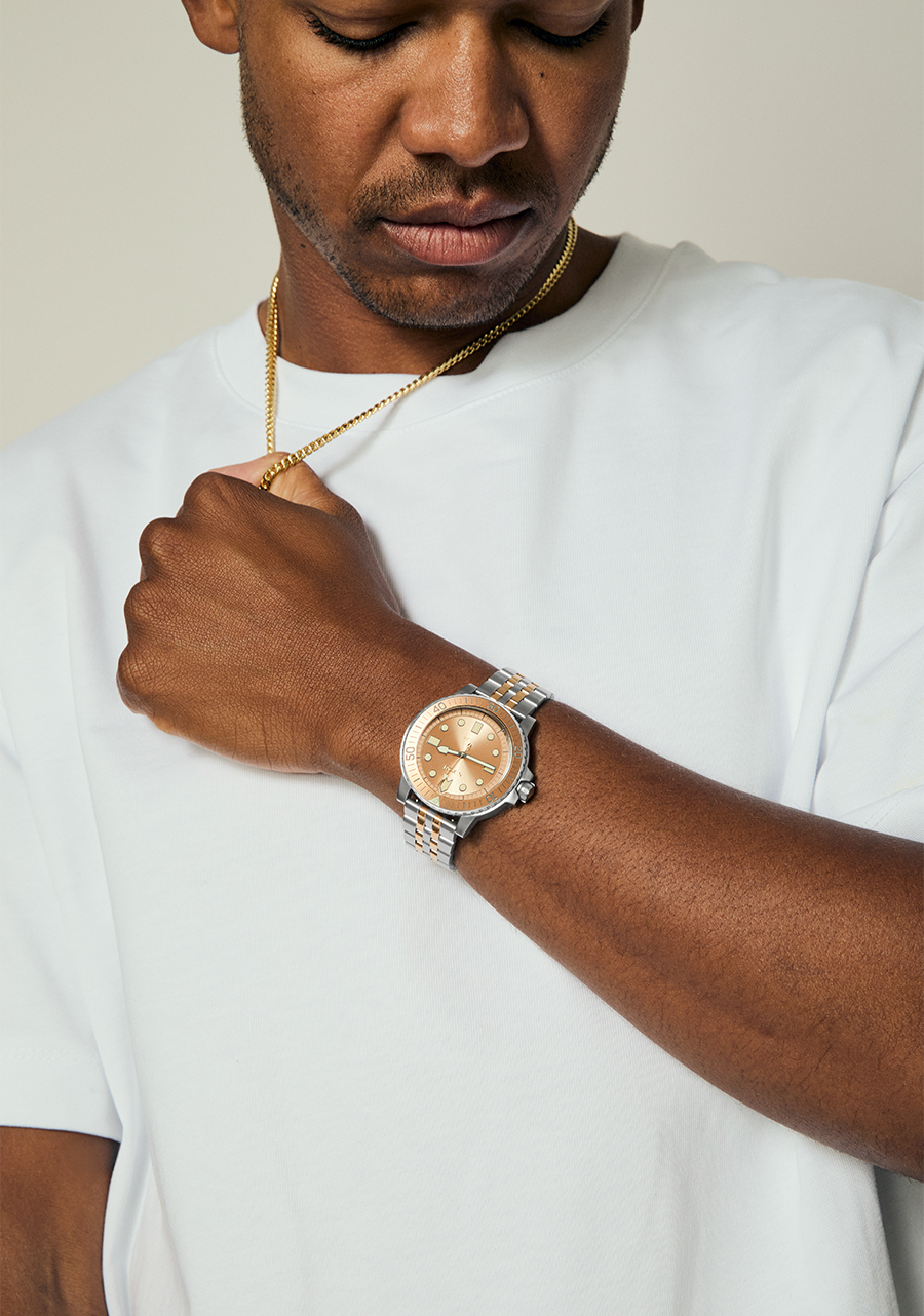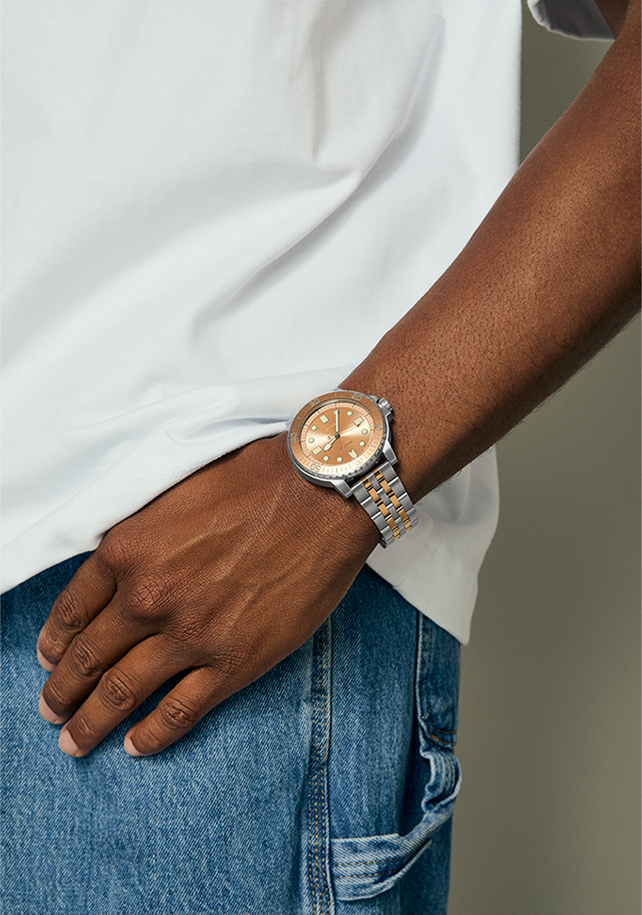 La esfera está rodeada por un anillo de esfera personalizado con una pista de segundos impresa, índices aplicados en negrita y manecillas moldeadas a medida. Se aplica luminiscencia a los índices y a las manecillas del reloj.