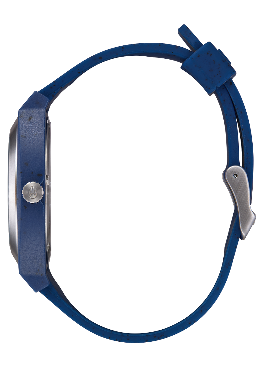Caja de plástico reciclado de 39.5 mm y bisel fijo de acero macizo con resistencia al agua de 100 metros / 10 ATM. Incluye cristal mineral endurecido, corona de acero inoxidable con triple junta, fondo de caja atornillado de acero inoxidable y asas con pasadores de resorte.